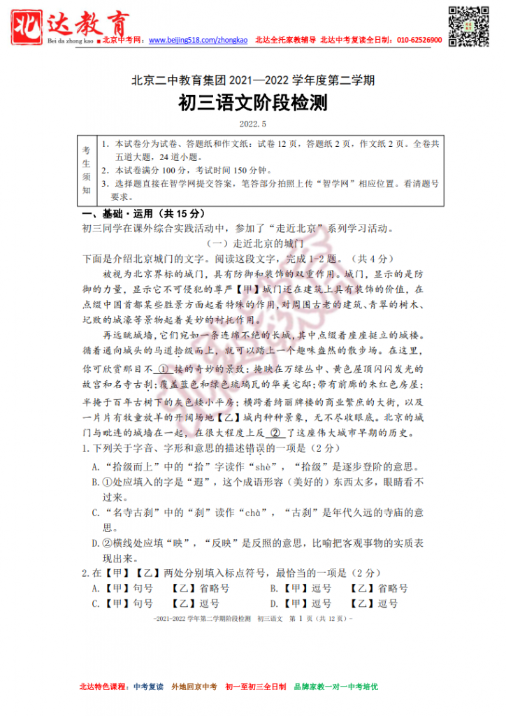 北京二中教育集团202205初三下语文阶段练习试题(高清版)。北达中考复读学校教研组收集整理,分享给大家。