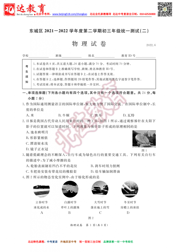 北京东城2022初三二模物理试卷及答案(高清版)!北达中考复读学校教研组收集整理,分享给大家。