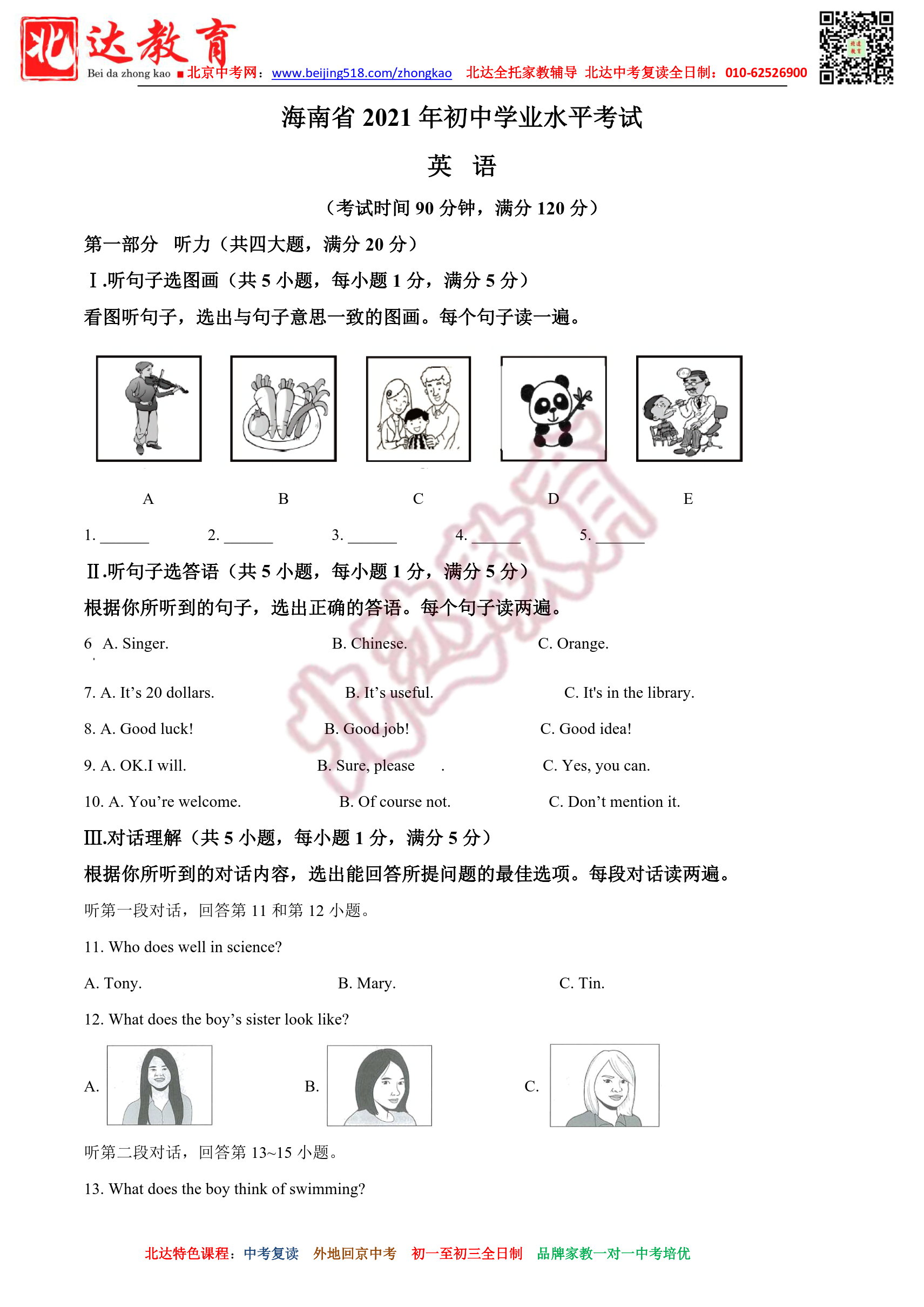 2021年海南中考英语试题及答案汇总。北达教研组收集整理,分享给大家。