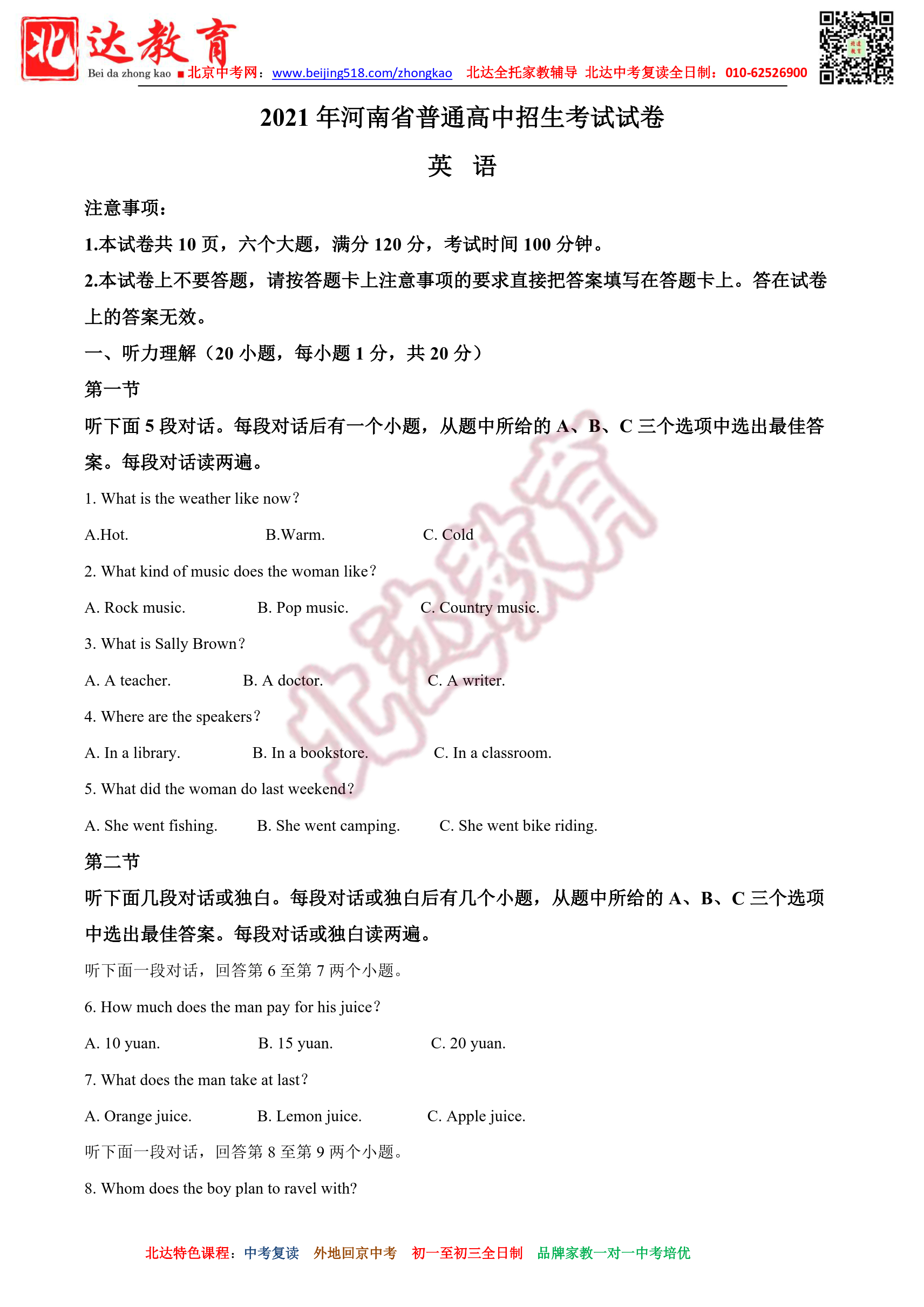 2021年河南中考英语试题及答案汇总。北达教研组收集整理,分享给大家。