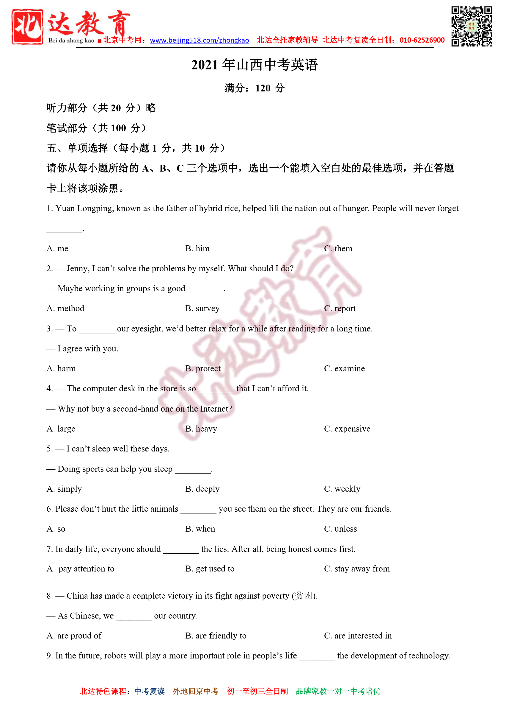 2021年山西中考英语试题及答案汇总。北达教研组收集整理,分享给大家。