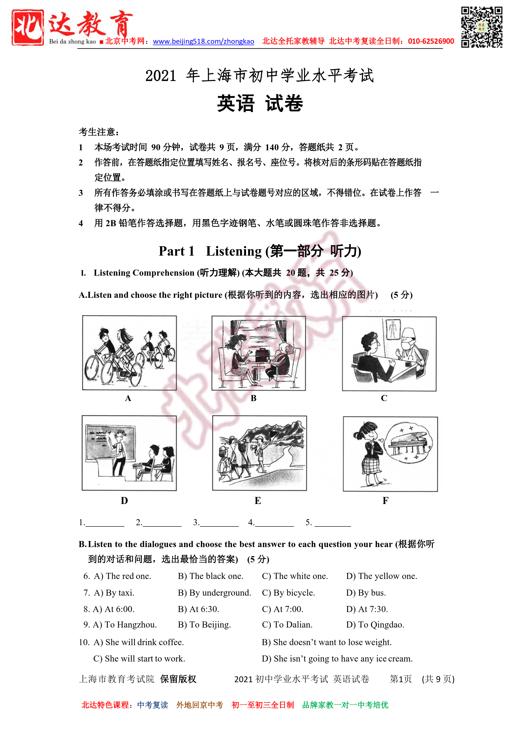 2021年上海中考英语试题及答案汇总。北达教研组收集整理,分享给大家。