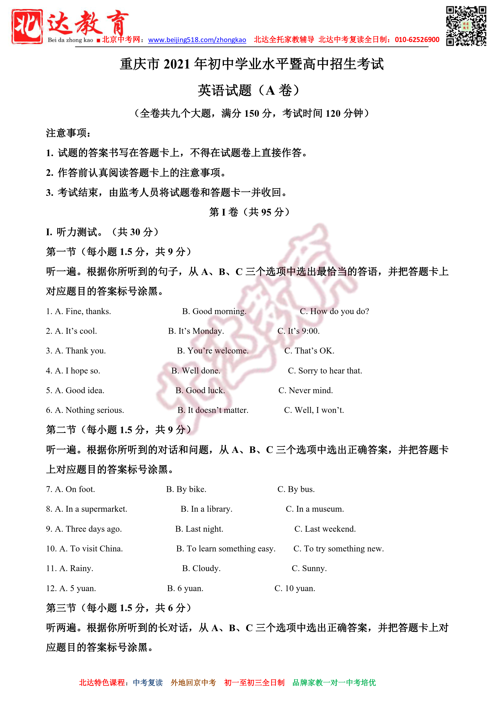 2021年重庆中考英语试题及答案汇总。北达教研组收集整理,分享给大家。