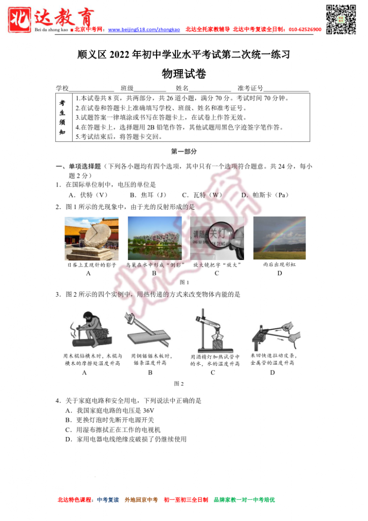 北京顺义2022初三二模物理试题及答案(高清版)!北达中考复读学校教研组收集整理,分享给大家。