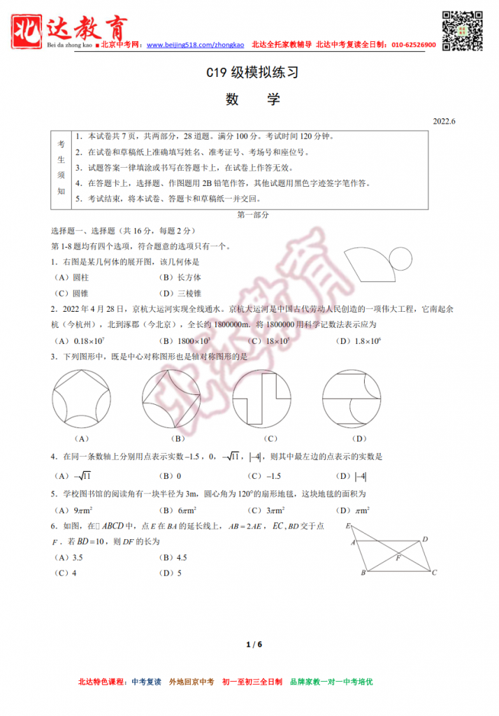 北京清华附中2022初三中考三模数学试卷(高清版)。北达中考复读学校教研组收集整理,分享给大家。