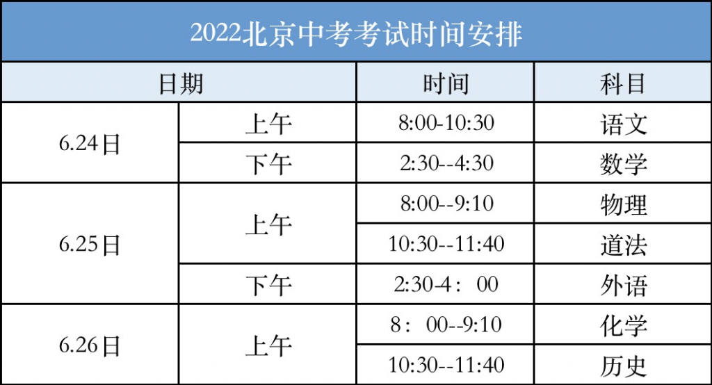 6月24日-26日初三年级学考考试时间表