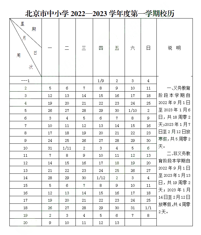 2022北京中小学开学时间是9月1日,本学期从2022年9月1日-2023年1月6日,共18周零2天。