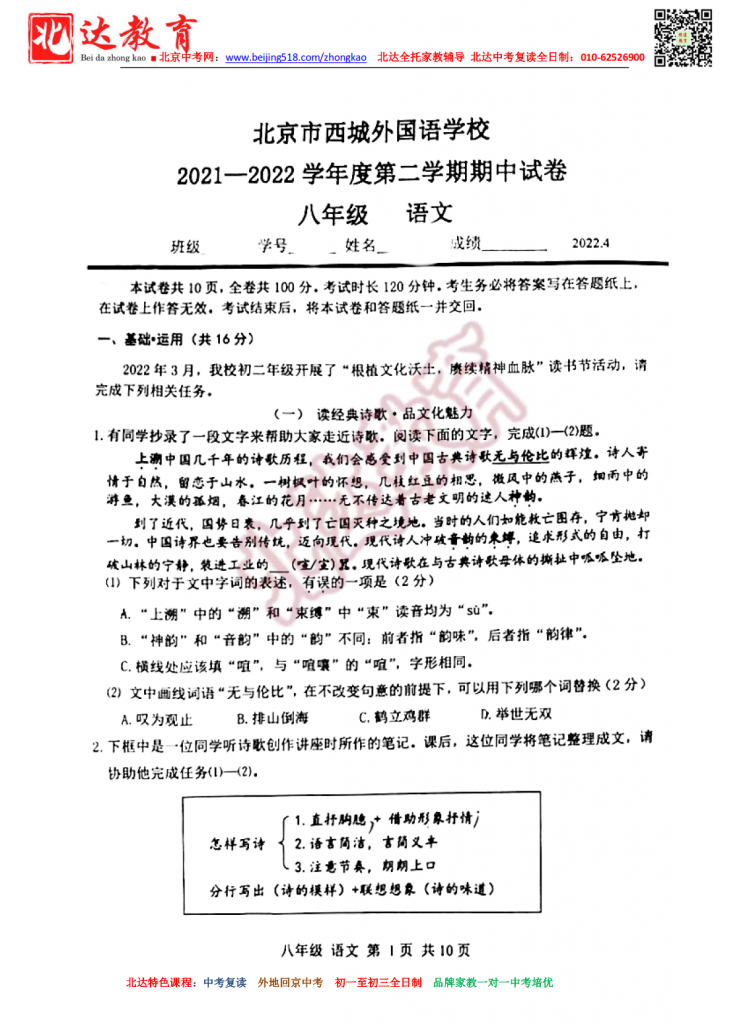 北京西城外国语学校2022初二下期中语文试卷(图片版)。北达中考复读学校教研组收集整理,分享给大家。