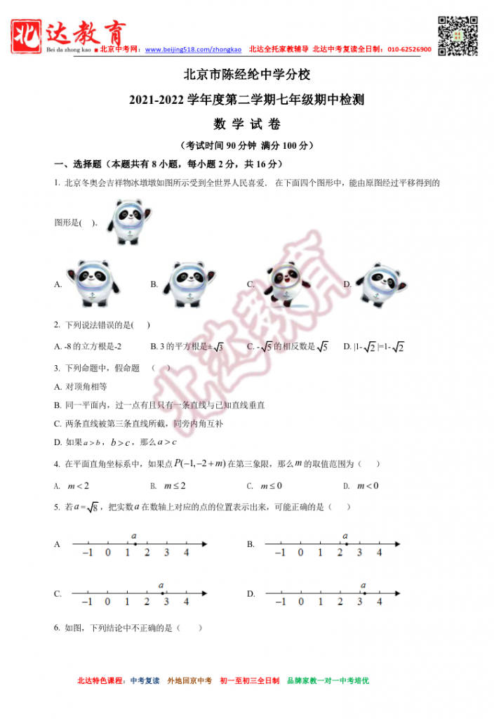 北京陈经纶中学分校2022七下期中数学试题及答案(高清版)。北达中考复读学校教研组收集整理,分享给大家。
