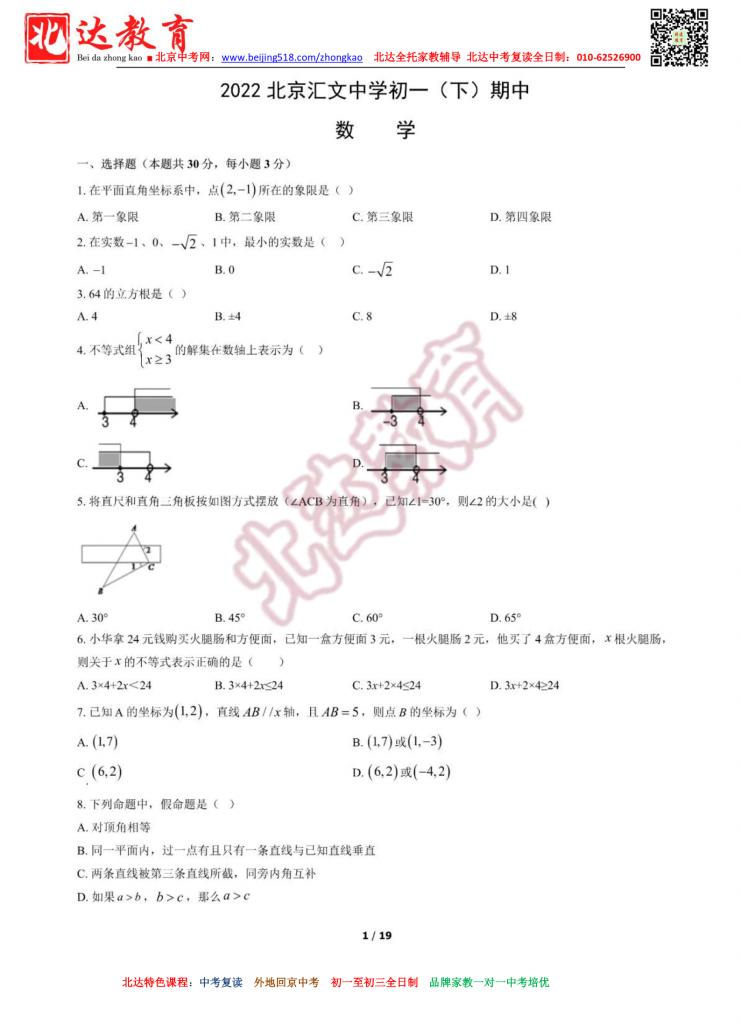 北京汇文中学2022初一下期中数学试题及答案(高清版)。北达中考复读学校教研组收集整理,分享给大家。