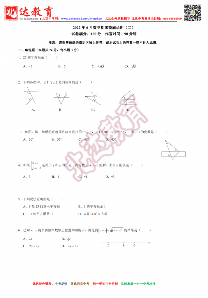 北京十一晋元分校202206初一下期末摸底诊断数学试卷二(高清版)。北达中考复读学校教研组收集整理,分享给大家。