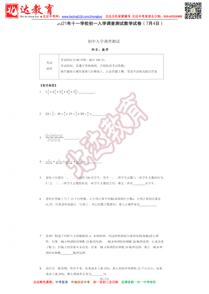 北京十一学校2021新初一入学调查测试数学试卷附答案(高清版)。北达中考复读学校教研组收集整理,分享给大家。