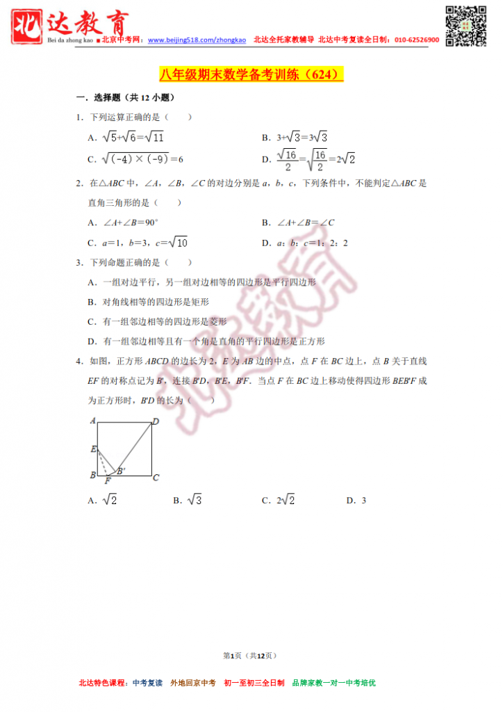 北京2022八年级下期末数学备考训练(624)学生版+解析版(高清版)。北达中考复读学校教研组收集整理,分享给大家。