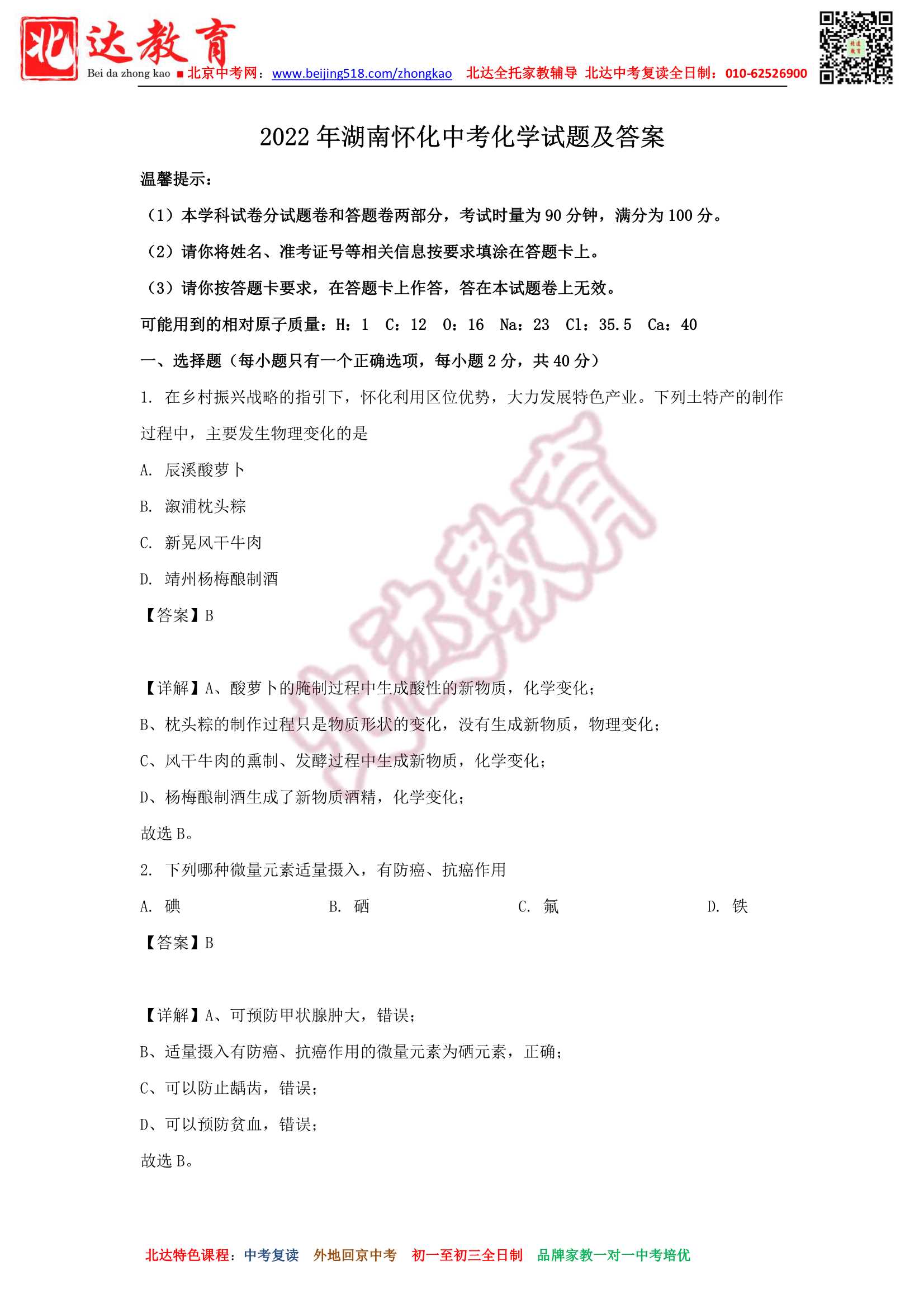2022年湖南怀化中考试题及答案汇总。北达教研组收集整理,分享给大家。