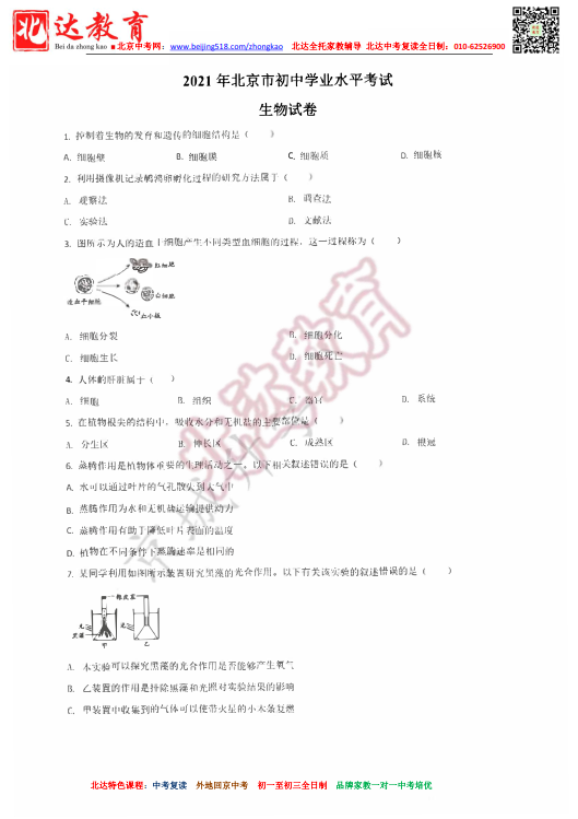 2021年北京北达教育竞技俱乐部生物试题及答案