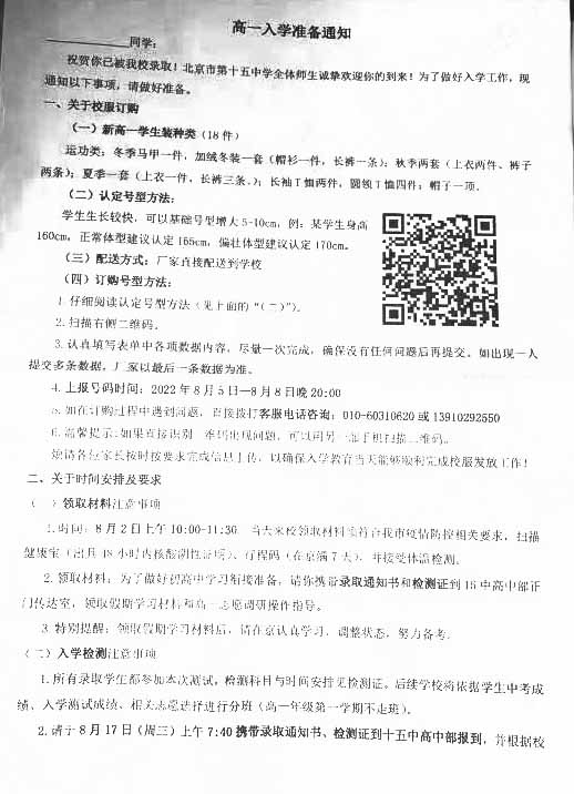 首页 中学资讯 2022年北京十五中新高一入学安排