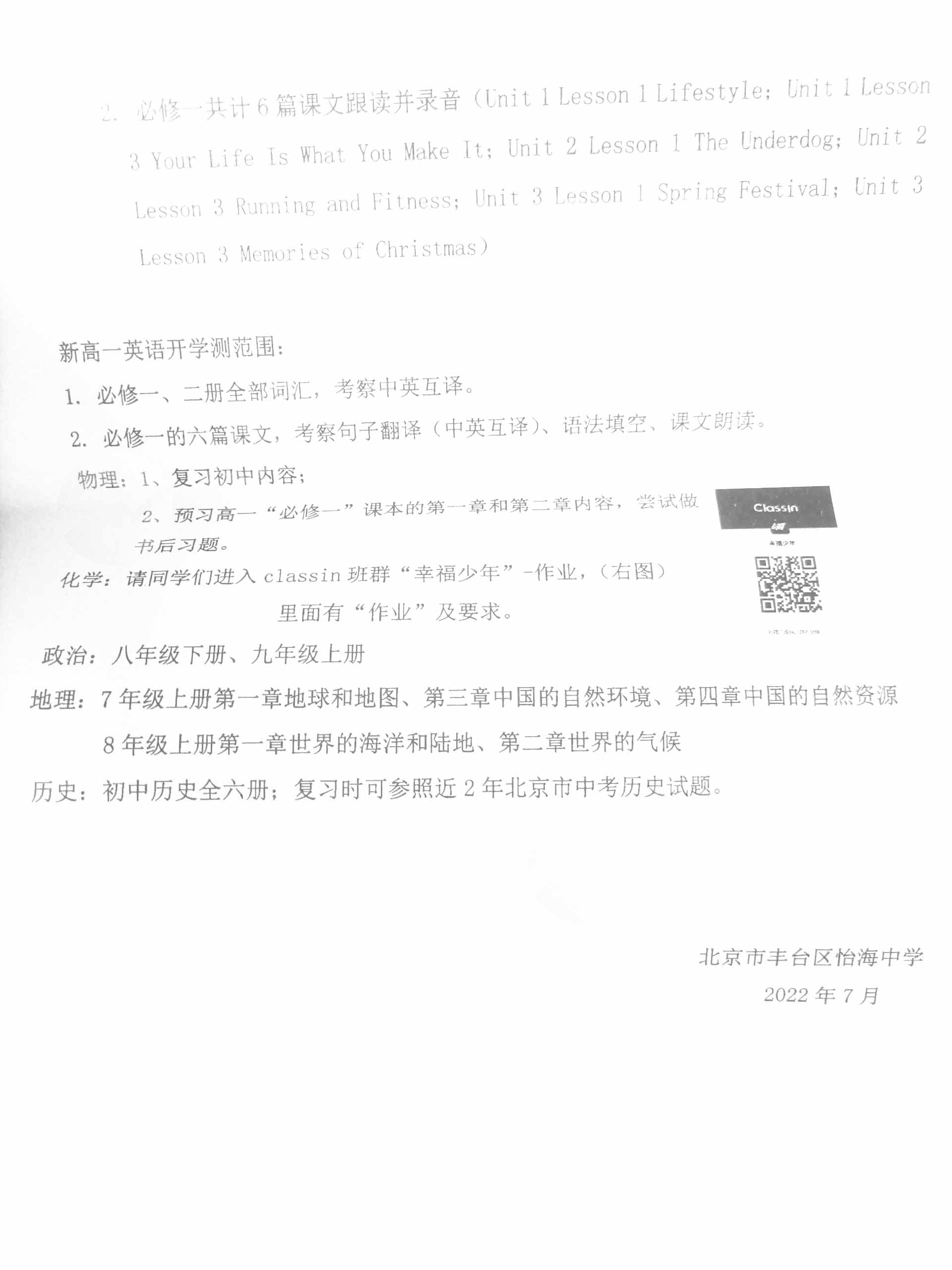 2022年丰台怡海中学新高一入学安排!北京北达教研组整理分享相关信息,供大家参考。