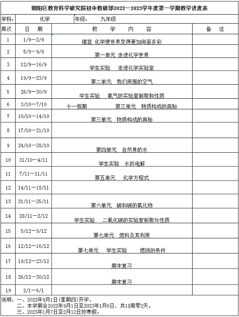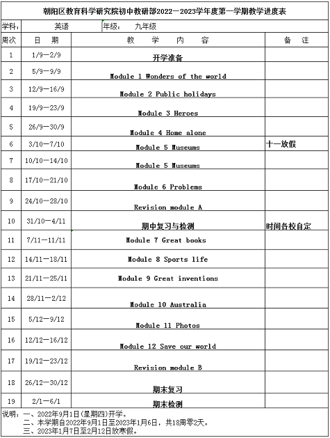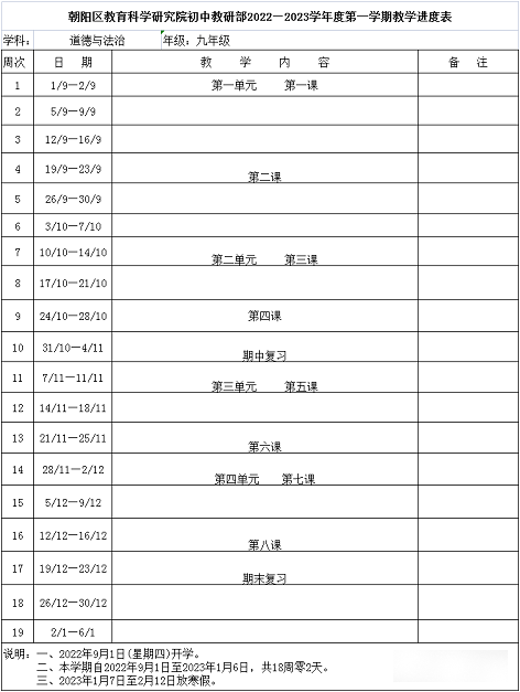 近日,朝阳区教育研究中心公布了《初中2022-2023学年度第一学期进度表》,详细介绍第一学期每门科目每月的教学进度,其中包含期中和期末考试时间安排,一起来看具体内容!