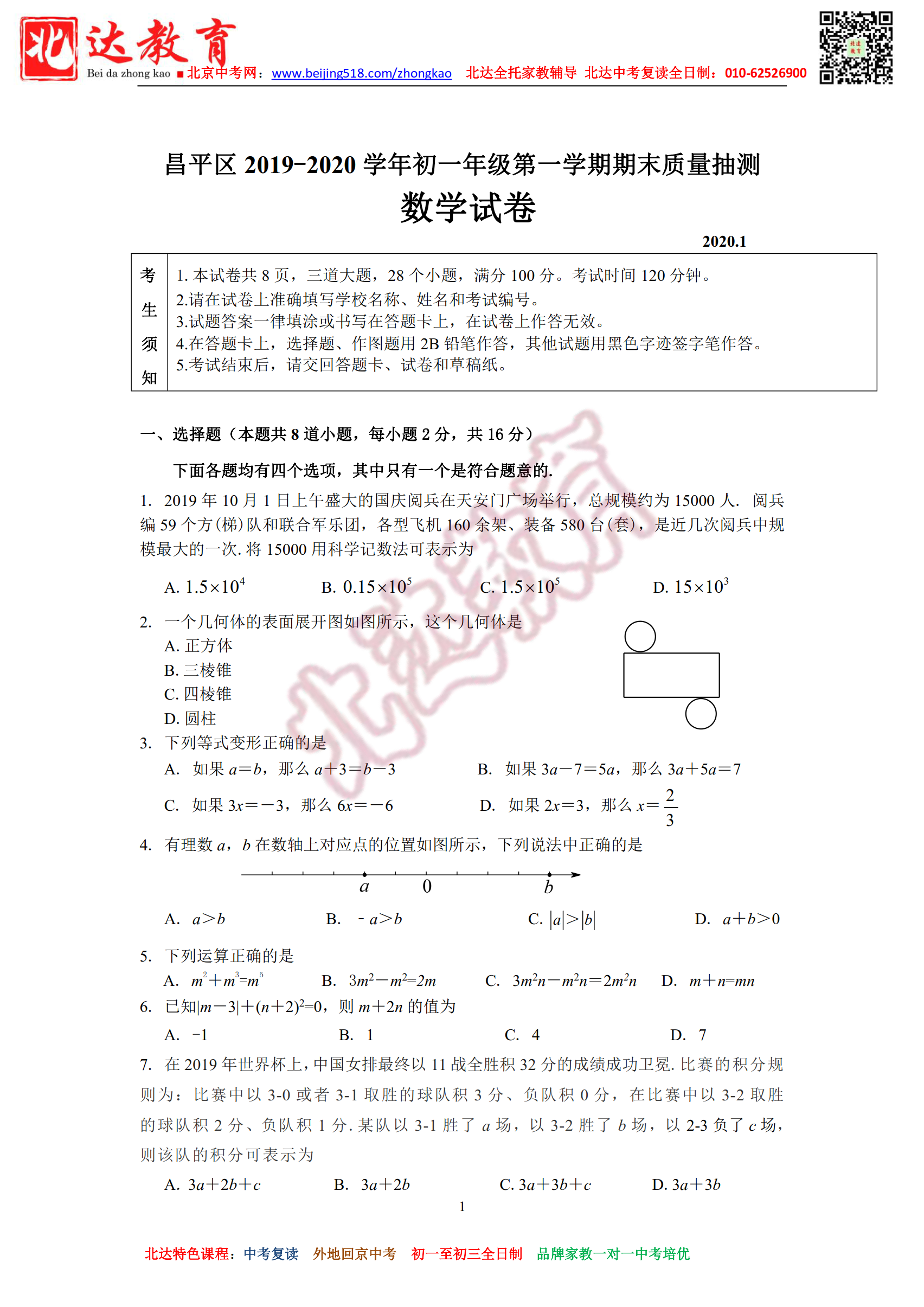 2019-2020学年北京昌平区初一上期末试题!北京北达教研组整理分享相关信息,供大家参考。