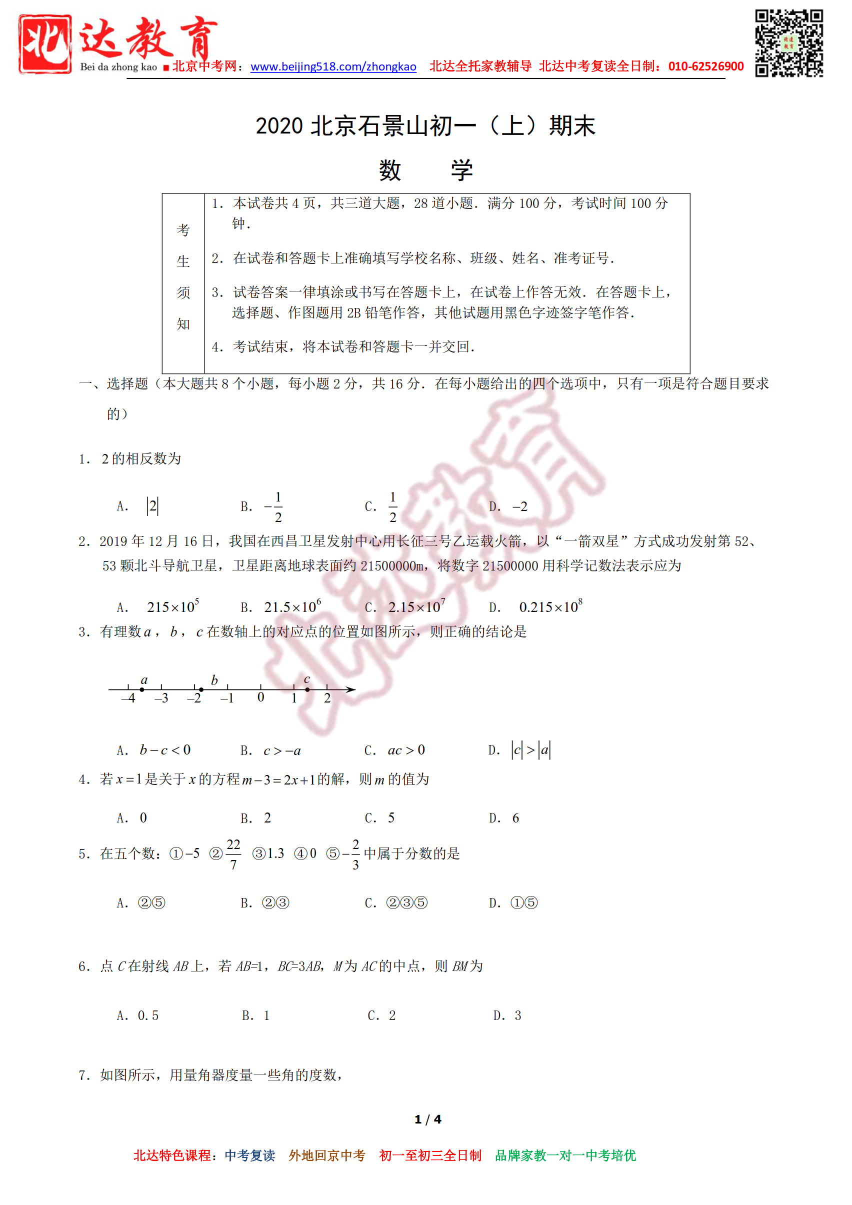 2019-2020学年北京石景山区初一上期末试题!北京北达教研组整理分享相关信息,供大家参考。