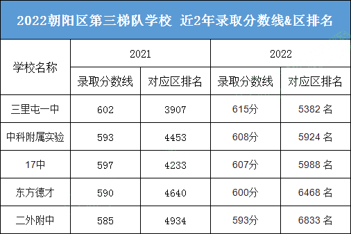根据朝阳区各分数段比率和朝阳区中招录取分数线,我们将朝阳区高中分为三个梯队: