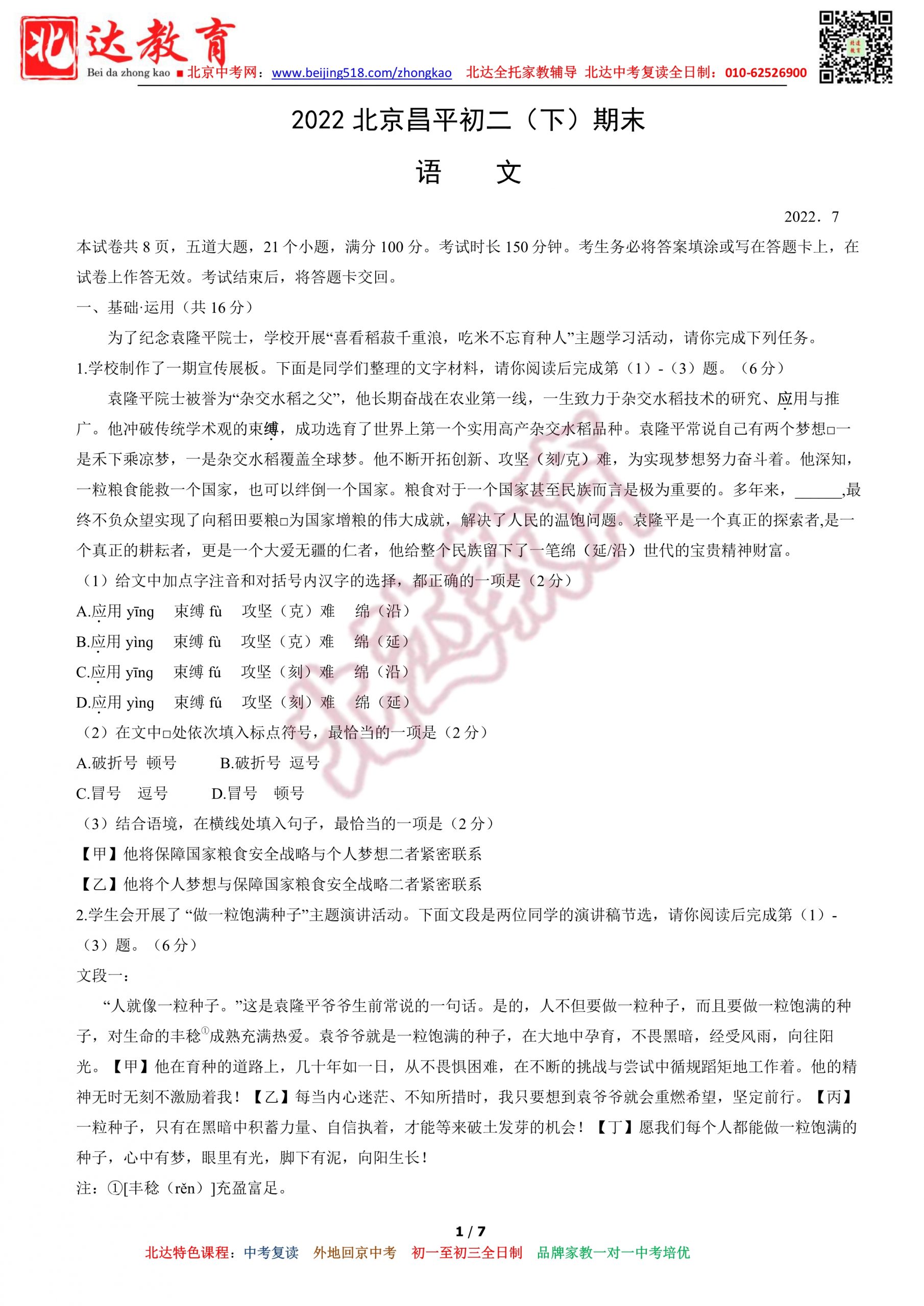 2022北京市昌平区初二(下)期末语文试卷(无答案)!北京北达教研组整理分享相关信息,供大家参考。