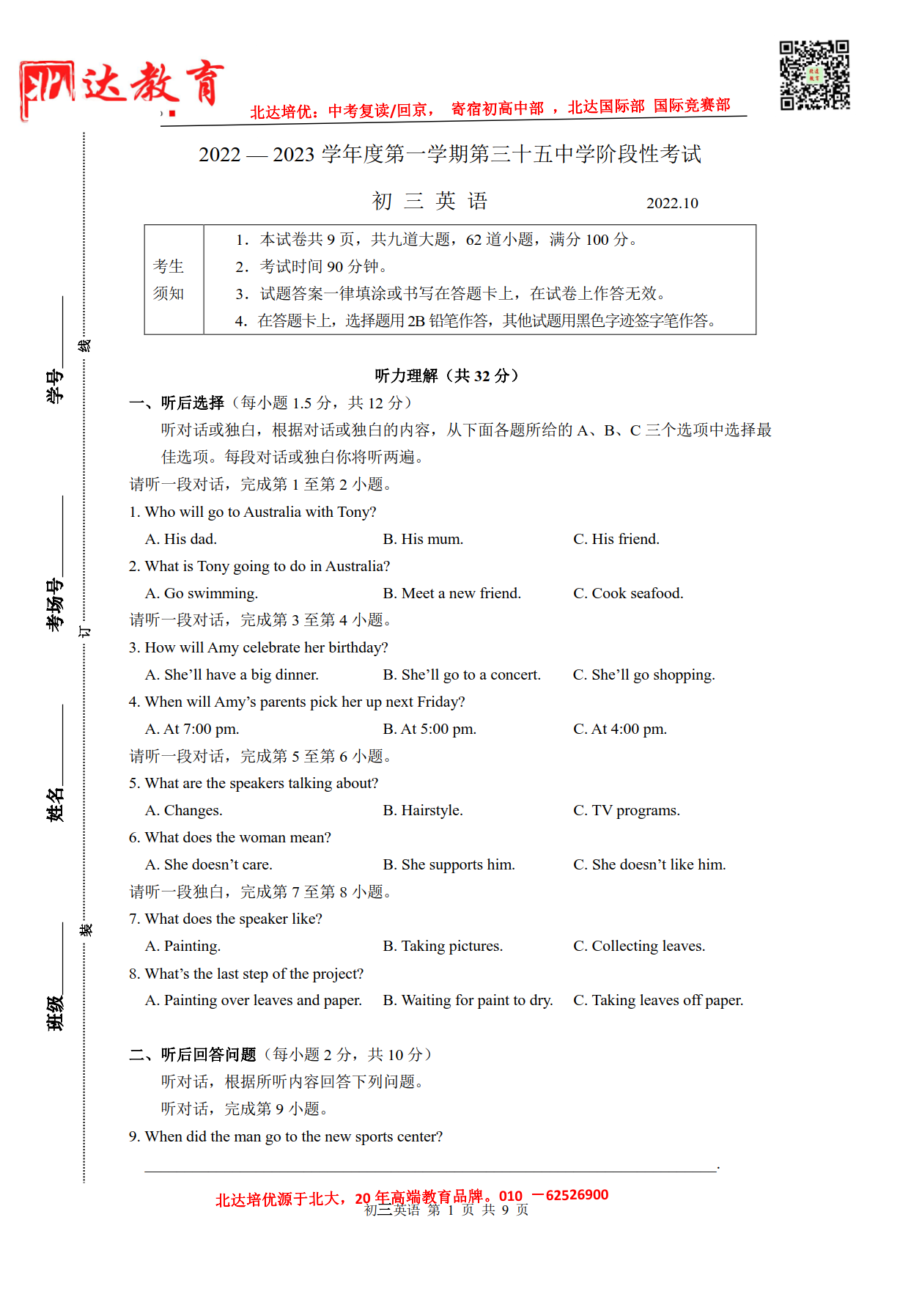 北达教研组为大家整理了2022北京三十五中初三英语10月月考试题,分享给大家。赶紧下载练起来吧。