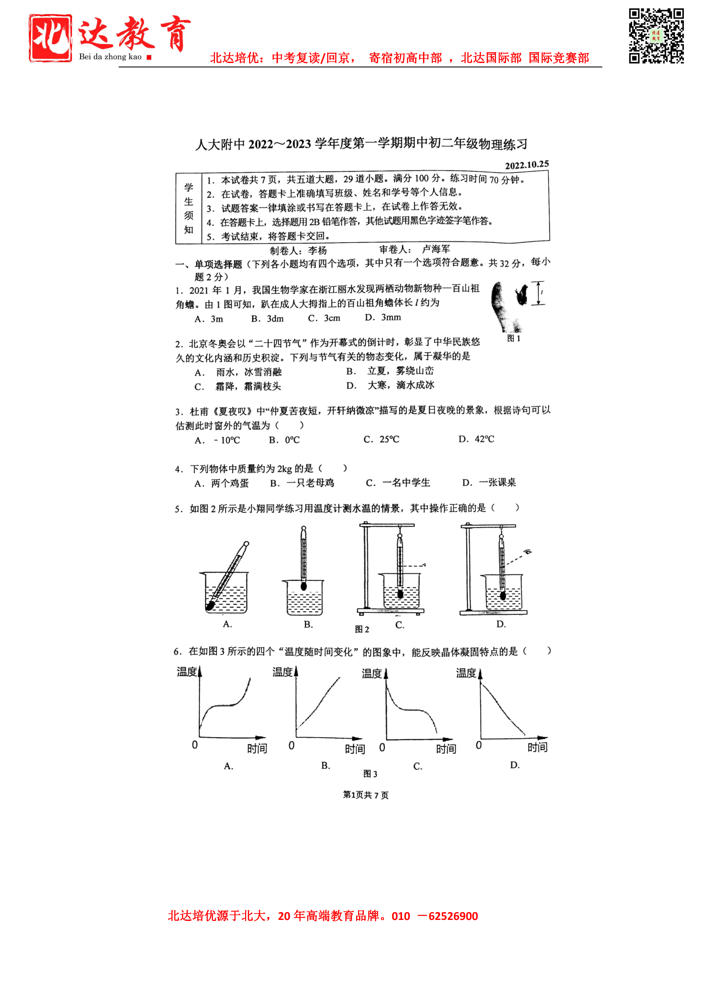 2022年北京海淀区人大附中初二(上)物理期中考试已结束,北达中考网第一时间为大家整理了试卷,分享给各位小伙伴。