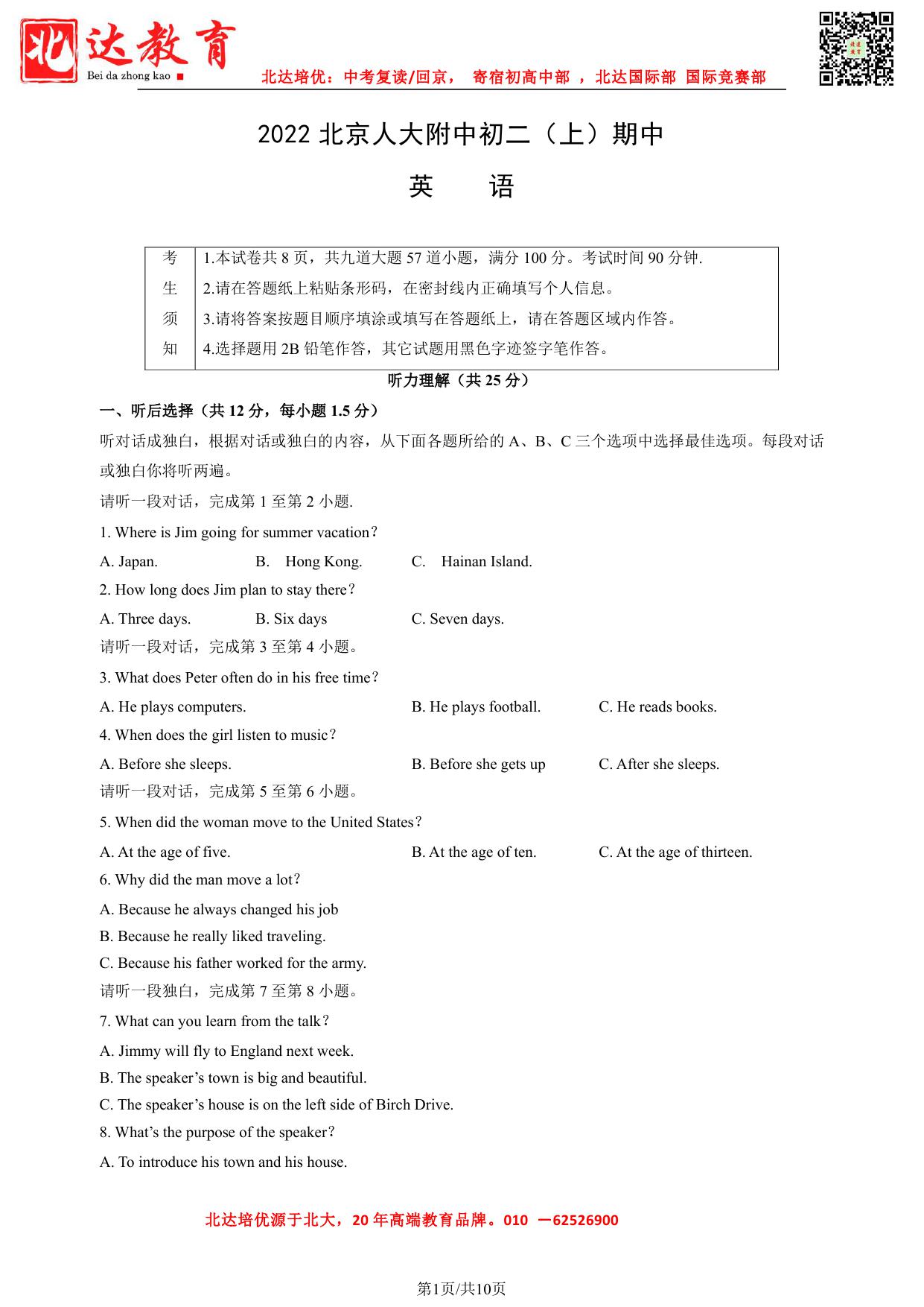 今天,北达中考网为大家整理了2022-2023学年北京人大附中初二(上)期中英语试卷及答案,分享给大家。赶紧下载练习起来吧。