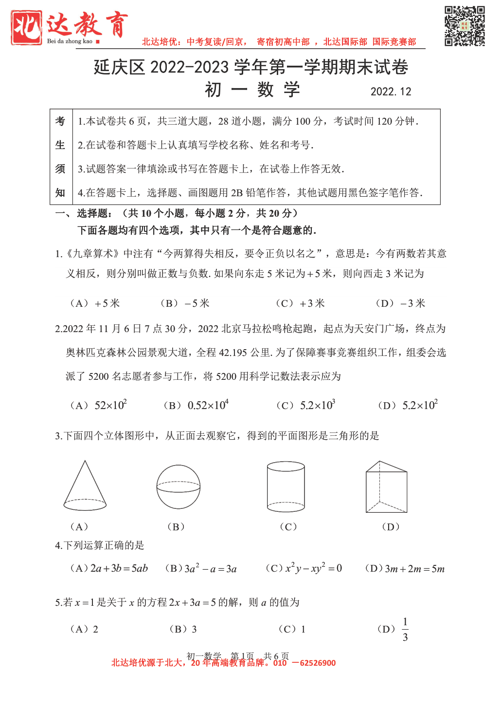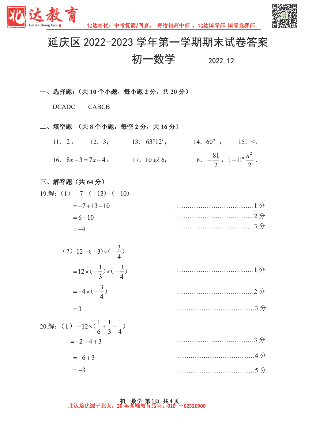 2022-2023学年北京延庆区初一上期末数学考试已结束,北达中考网第一时间 为大家整理了相关试题及答案,分享给大家。