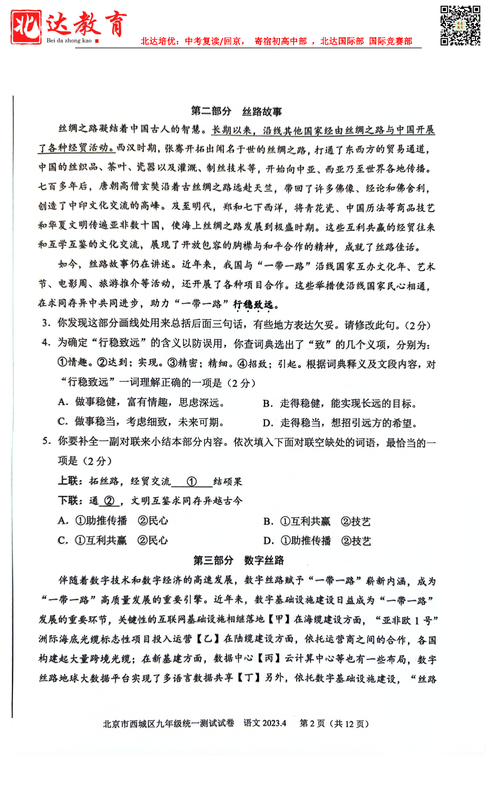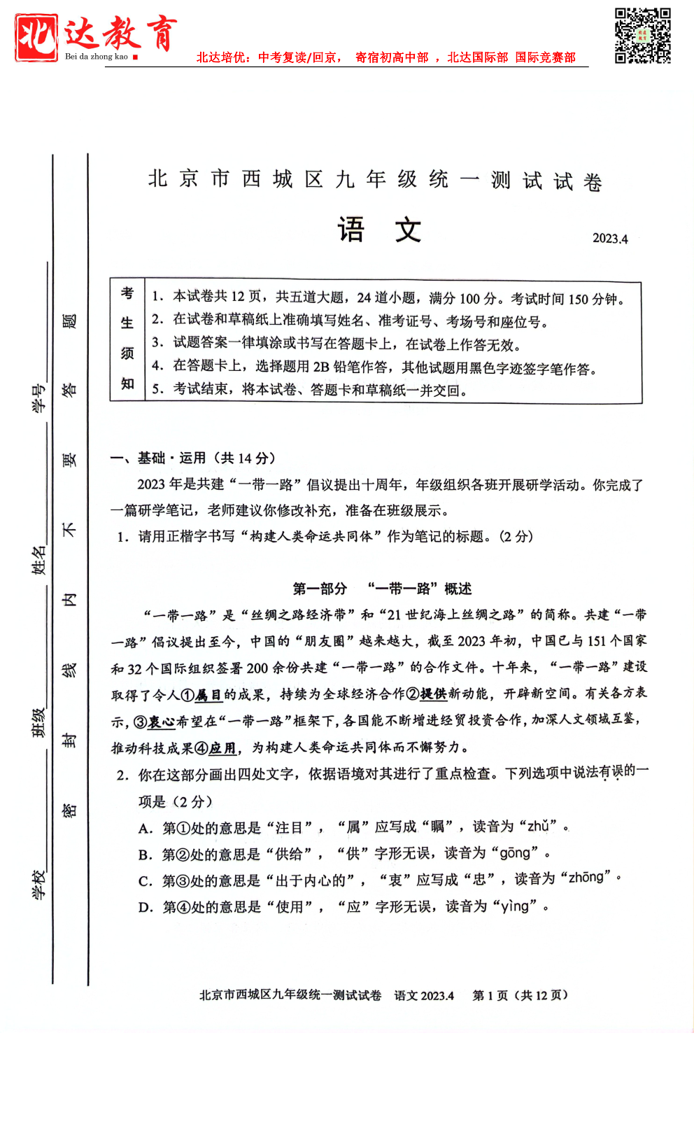 北达中考网第一时间为大家整理了2023北京西城区初三一模语文试题及答案,分享给大家。
