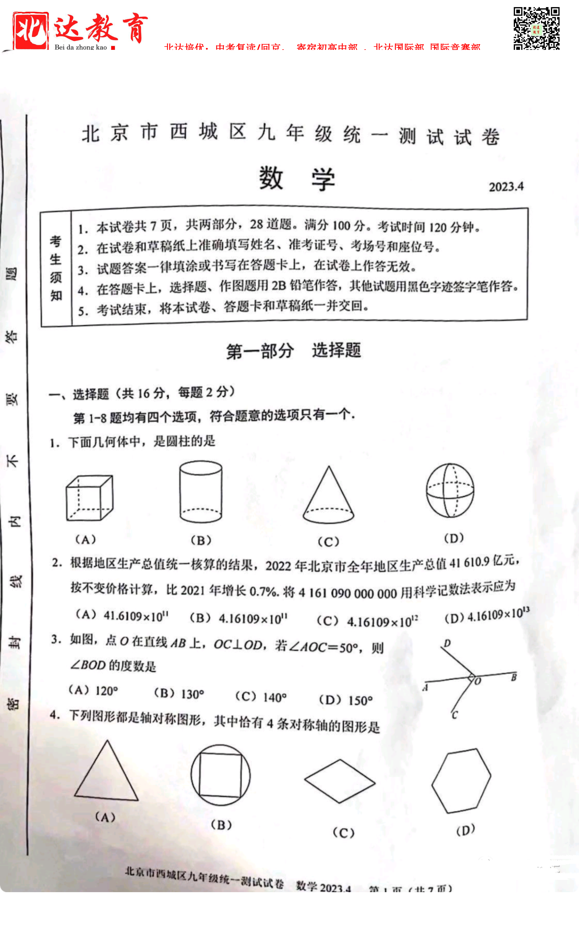 北达中考网第一时间为大家整理了2023北京西城区初三一模数学试题及答案,分享给大家。