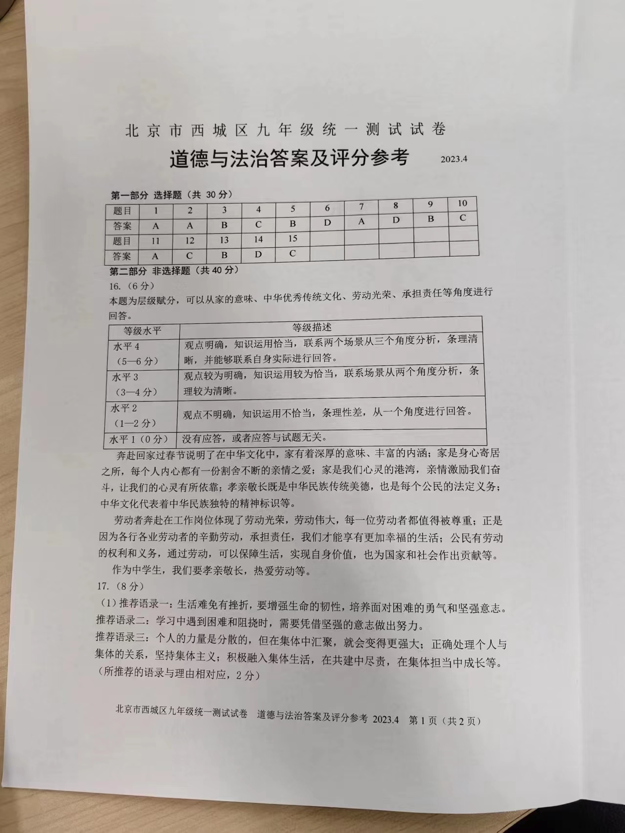 北达中考网第一时间为大家整理了2023北京西城区初三一模道法试题及答案,分享给大家。