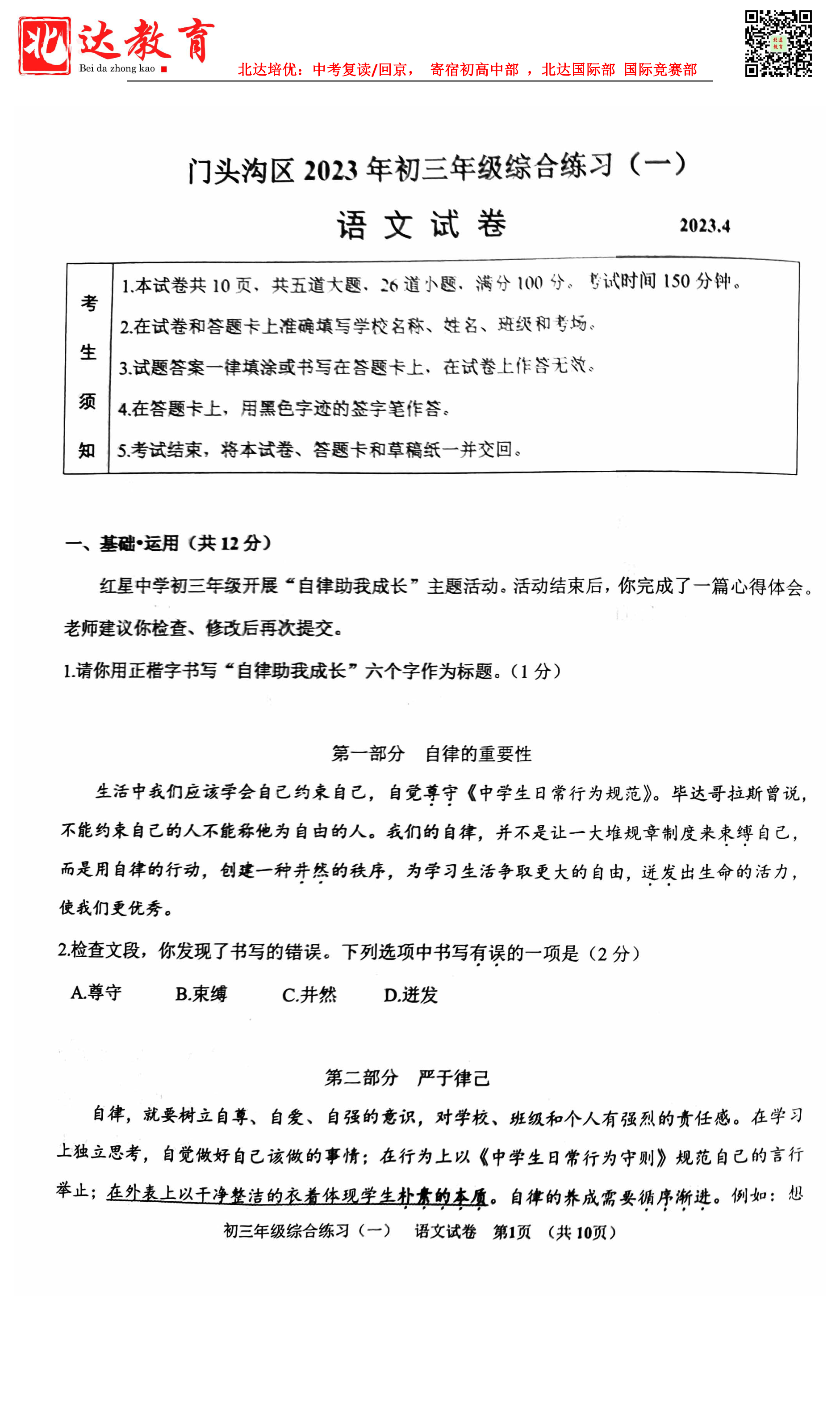 北达中考网第一时间为大家整理了2023北京门头沟区初三一模语文试题及答案,分享给大家。