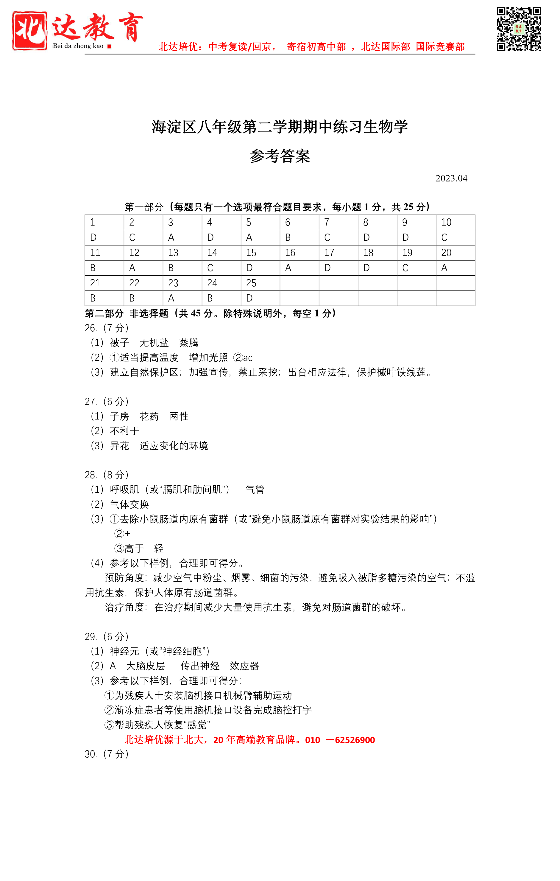 2023北京海淀初二下生物期中考已结束,北达中考网为大家整理了 试题及答案,分享给大家。