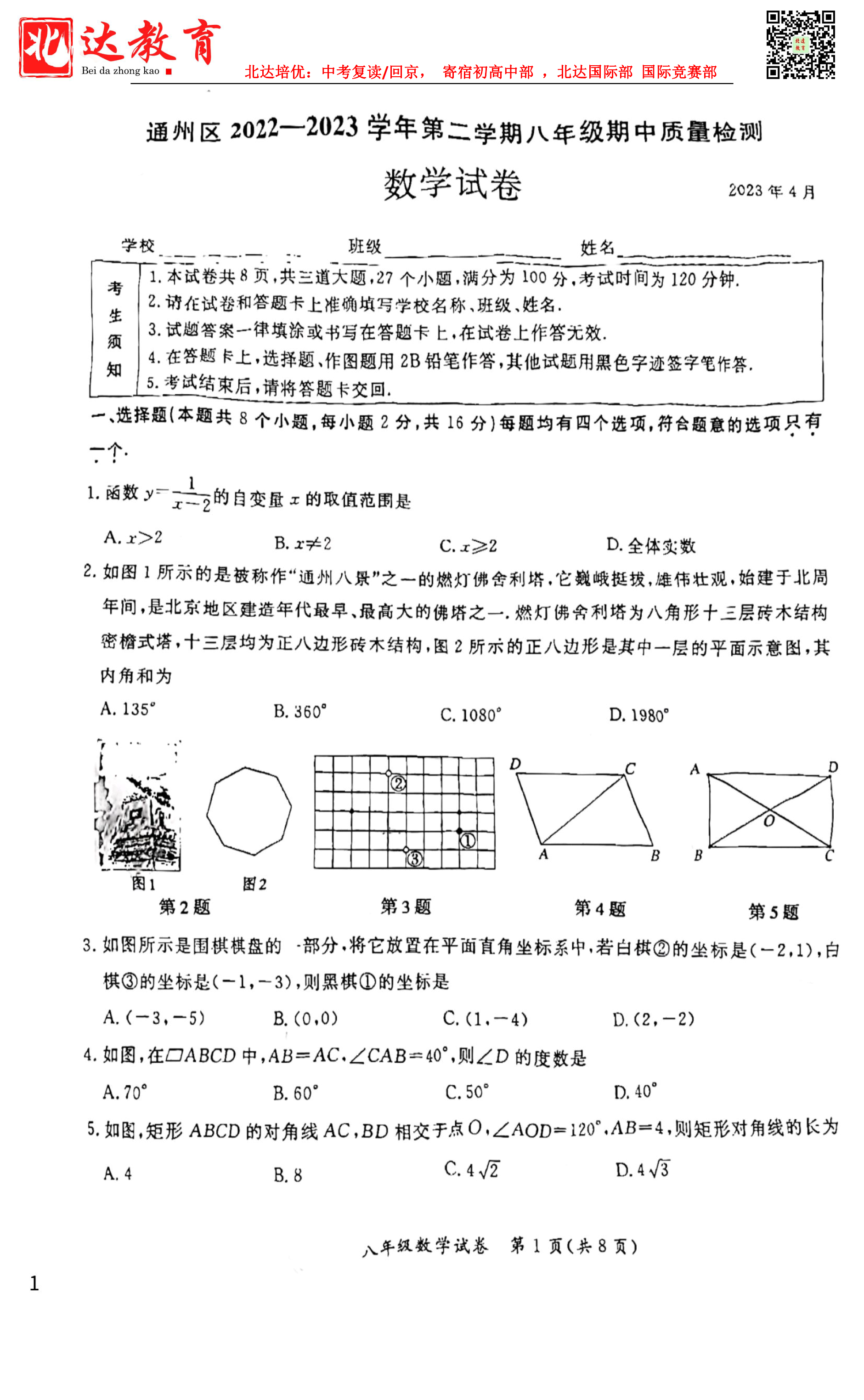 2023北京通州区初二下数学期中考已结束,北达中考网为大家整理了 试题及答案,分享给大家。