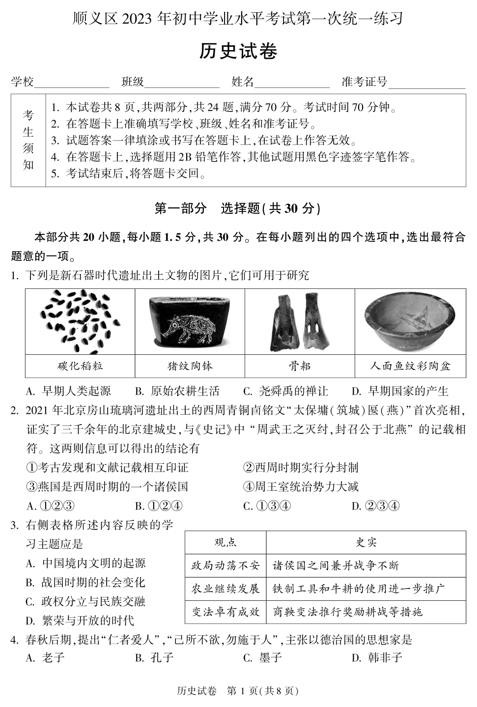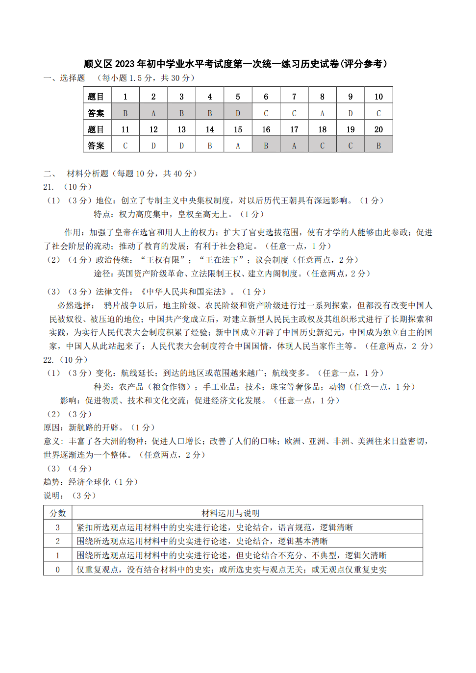 北达中考网第一时间为大家整理了2023北京顺义区初三一模历史试题及答案,分享给大家。