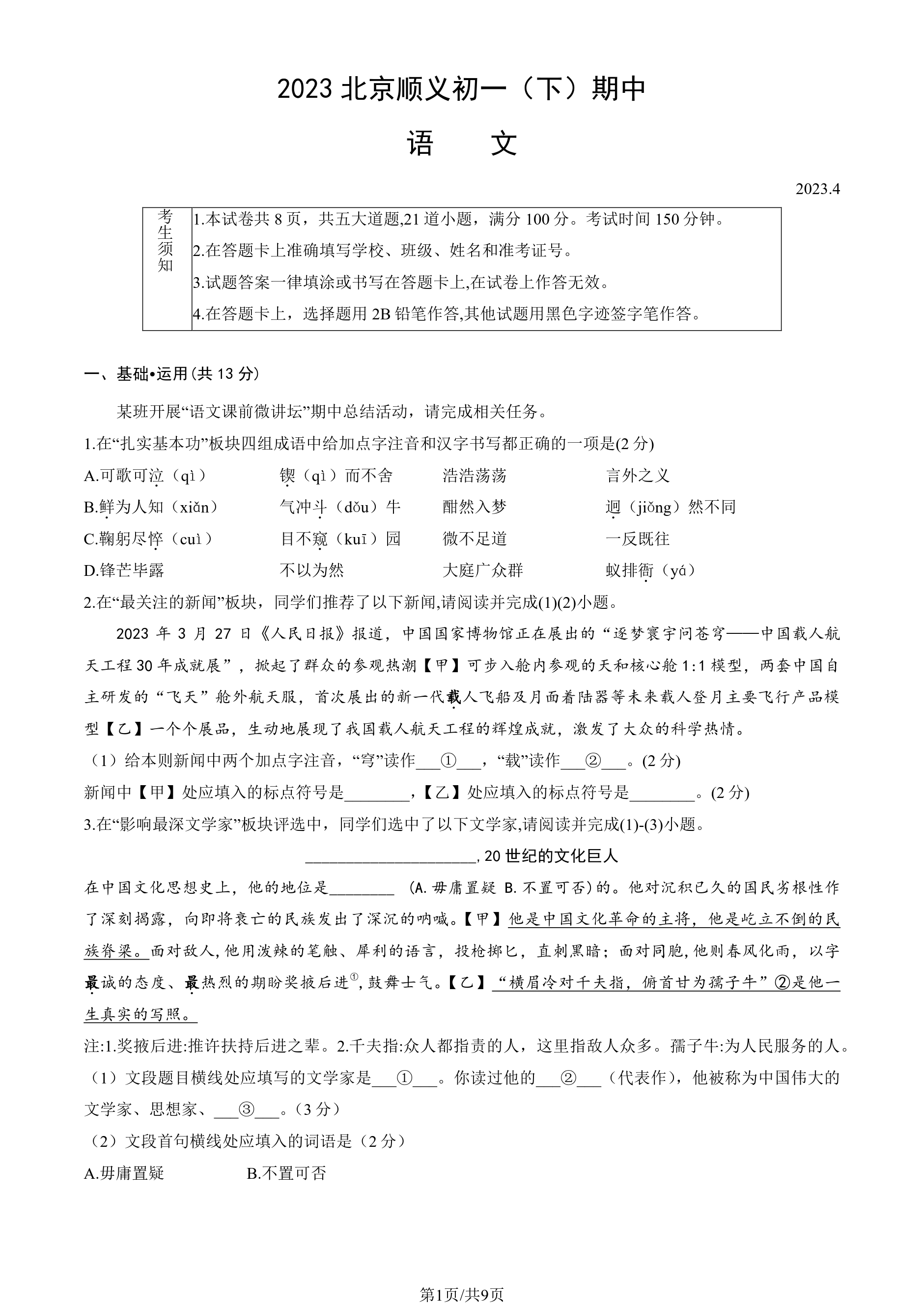 2023学年顺义初一历史期中考考试已结束,北达中考网为大家整理了试题及答案,分享给大家。