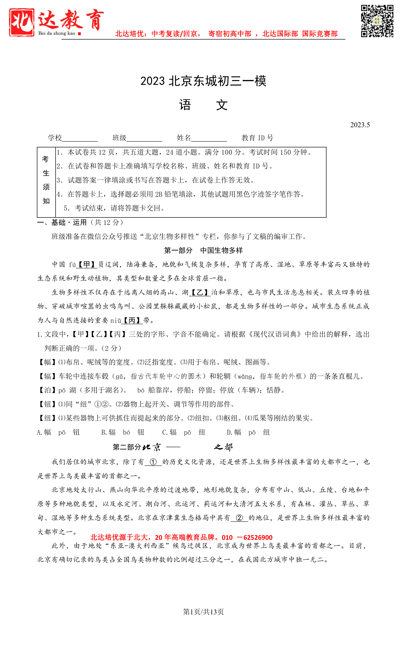 北达中考网第一时间为大家整理了2023北京东城区初三一模语文试题及答案,分享给大家。