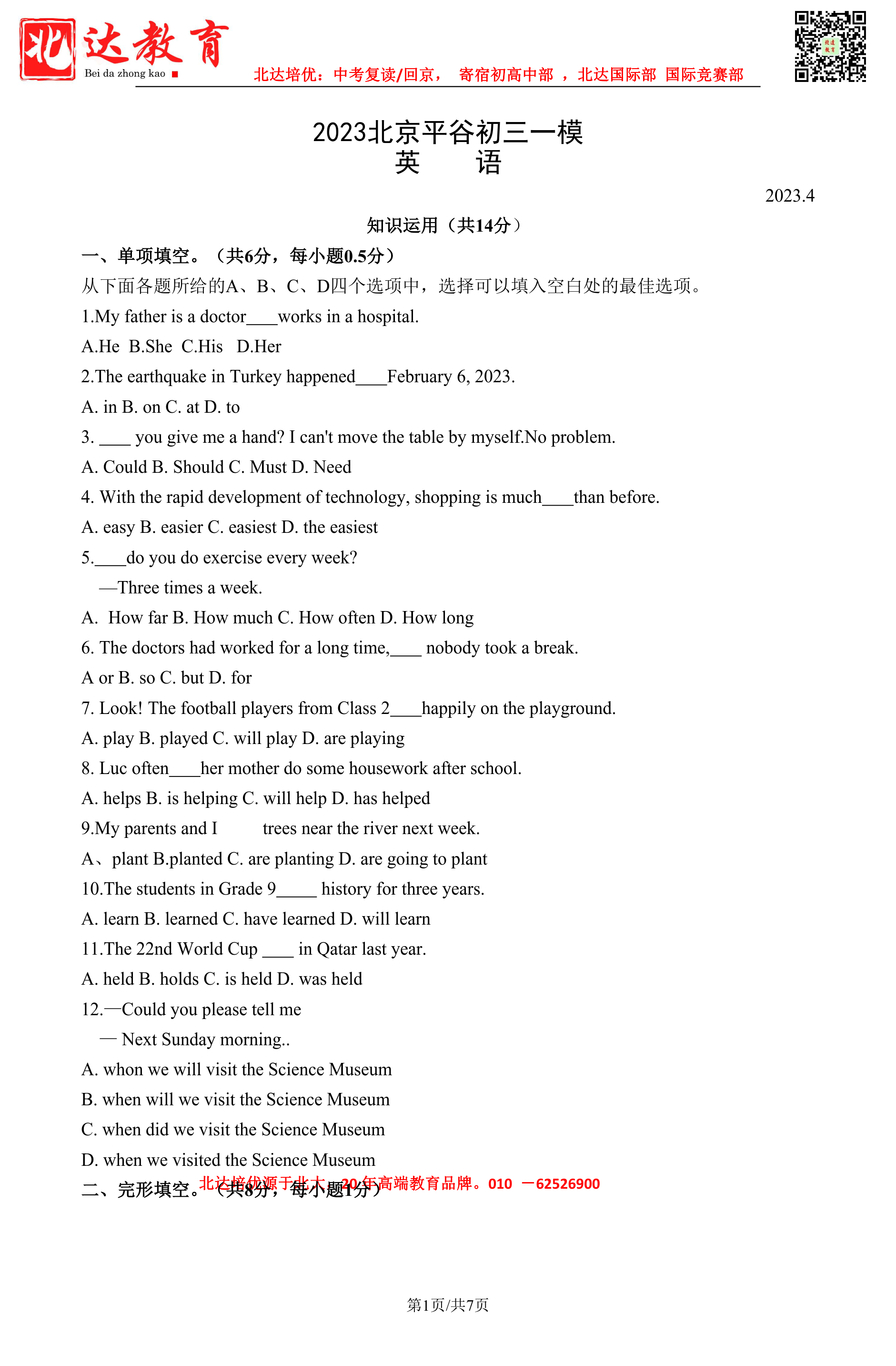 北达中考网为大家整理了2023北京平谷区初三一模英语试题及答案,分享给大家。