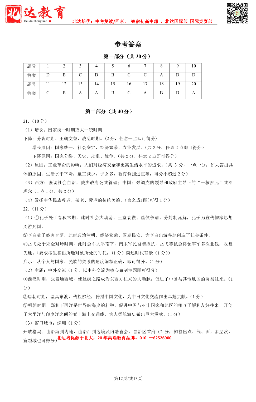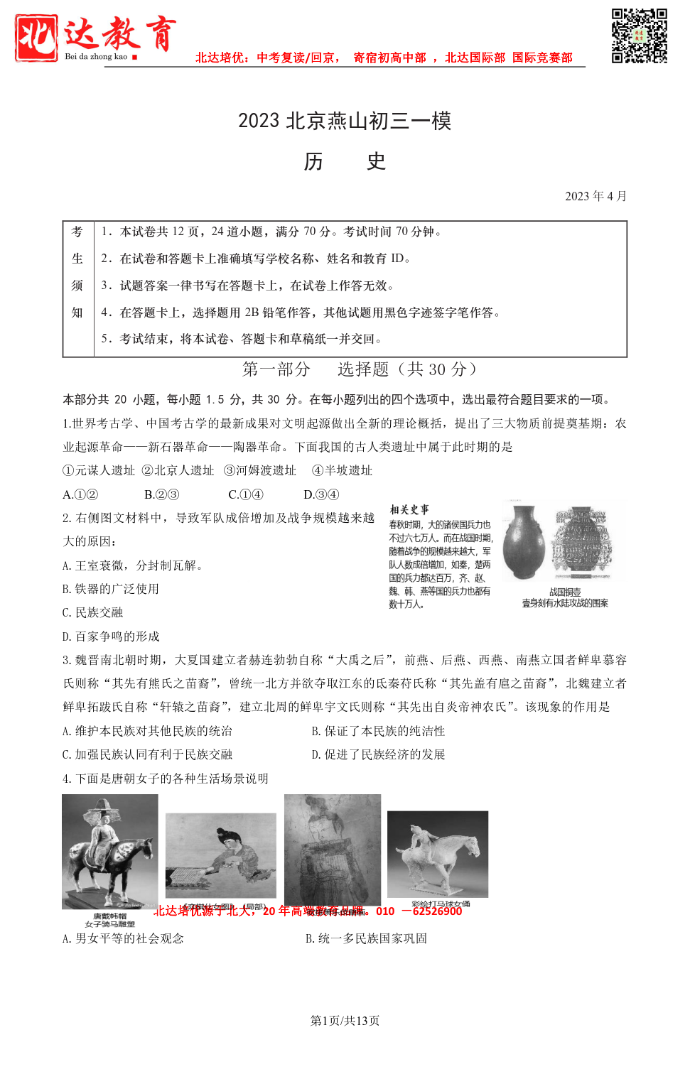 北达中考网为大家整理了2023北京燕山区初三一模历史试题及答案,分享给大家。