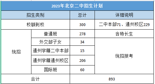 2023北京二中招生计划总人数为893人,比去年增加了85人,扩招明显。