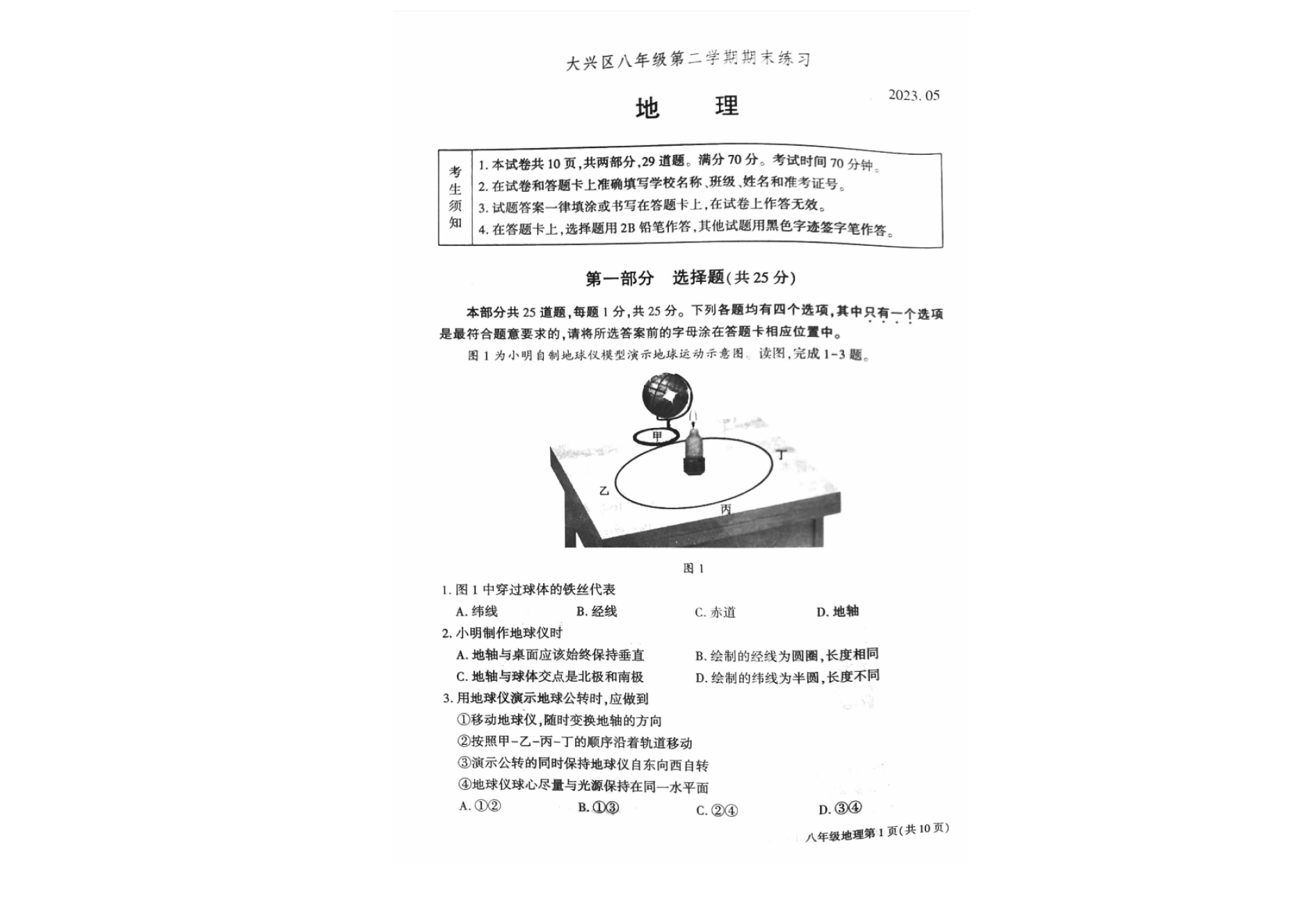 2023年北京大兴区初二二模考地理试卷已出炉,北达中考网第一时间整理并分享在本页面,供大家参考学习!