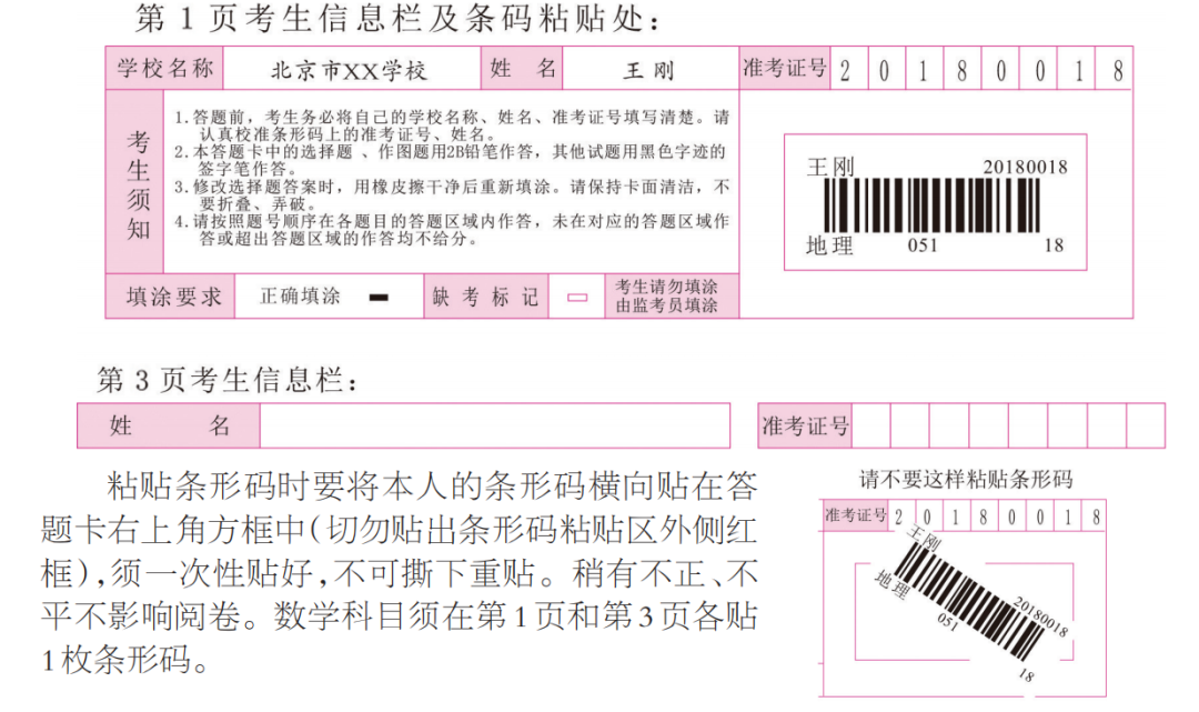 3.答题前要仔细阅读答题卡上的“考生须知”。务必用黑色字迹的签字笔将答题卡第1页左上角(数学科目还有第3页左上角)的学校名称、姓名、准考证号填写清楚,字迹不能超出框线。考生不得自行填涂"缺考标记"栏。如下图所示: