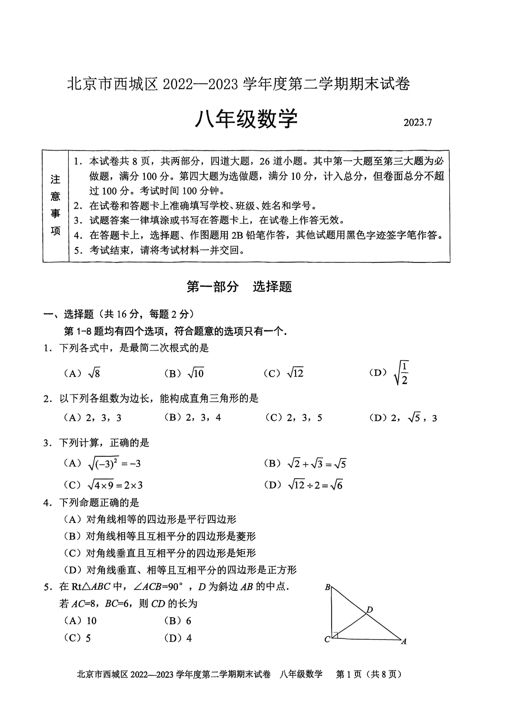 首页 初二试题 2023北京西城区初二(下)期末数学试题及答案