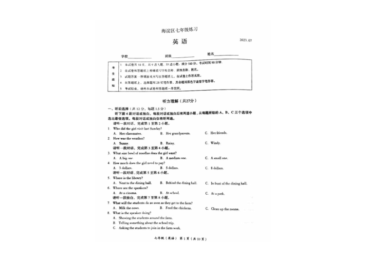 2023北京各区初一期末考已陆续开始,北达中考网为大家整理了 试题及答案,分享给大家。