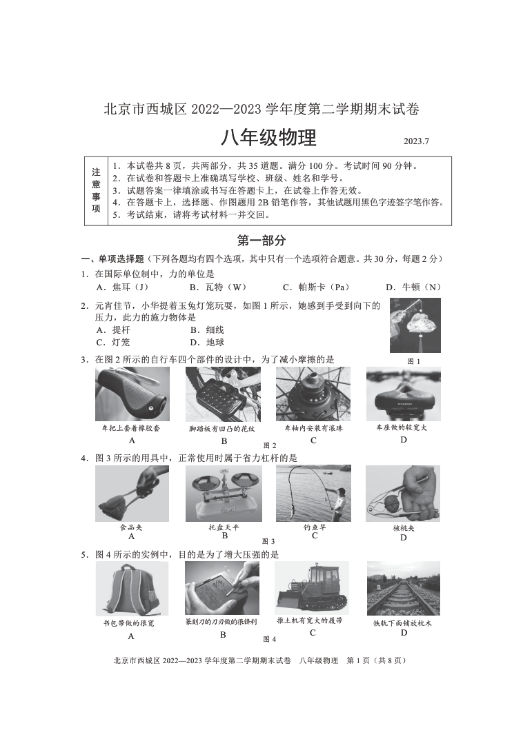 2023北京西城区初二(下)期末物理试题及答案