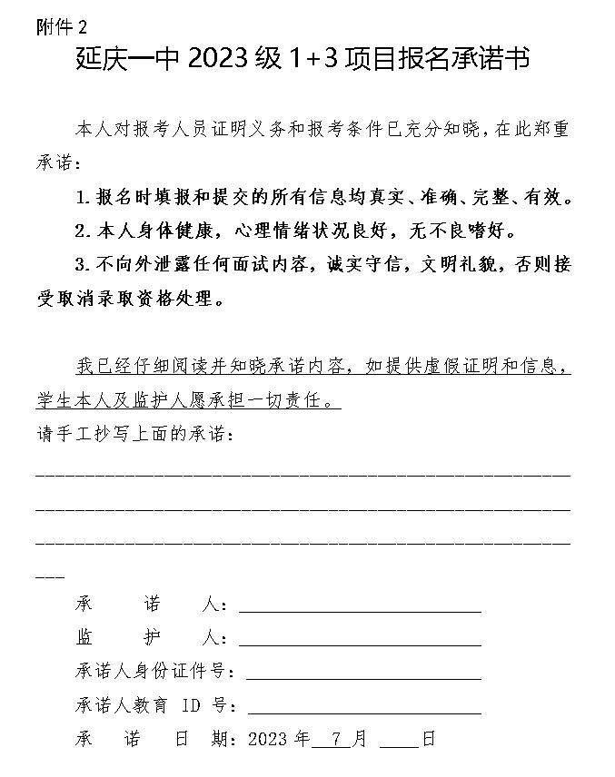 2.延庆一中2023级1+3报名承诺书(见附件2)