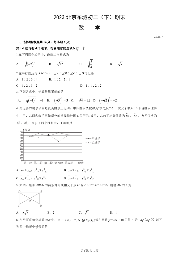 首页 初二试题 2023北京东城区初二(下)期末数学试题及答案