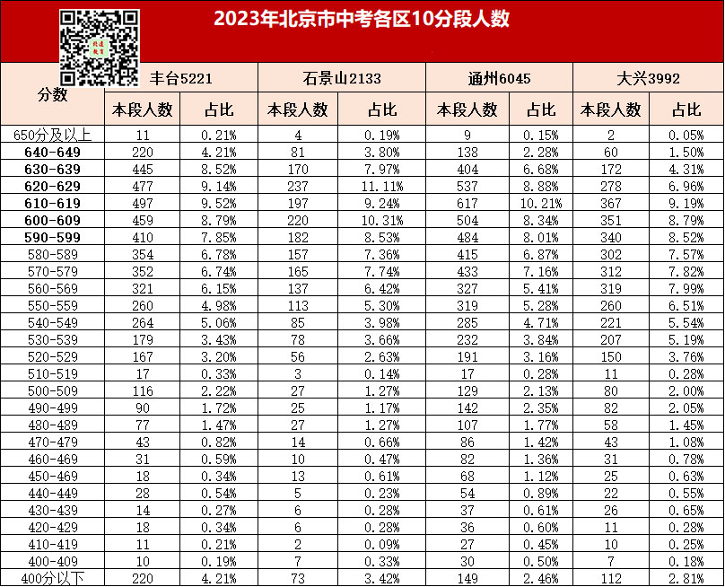 北达中考网整理了2023北京丰台、石景山、通州、大兴中考10分段人数统计,分享给大家。